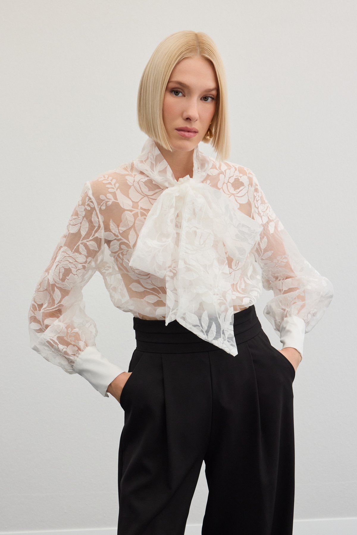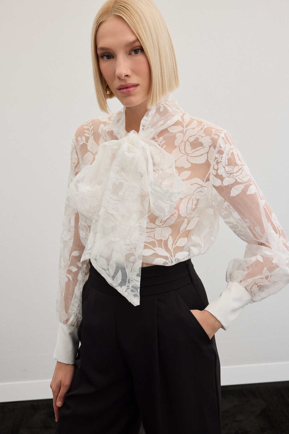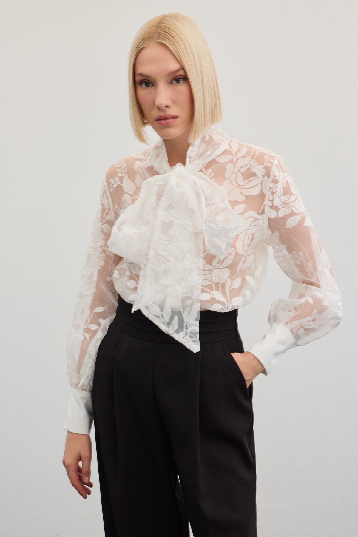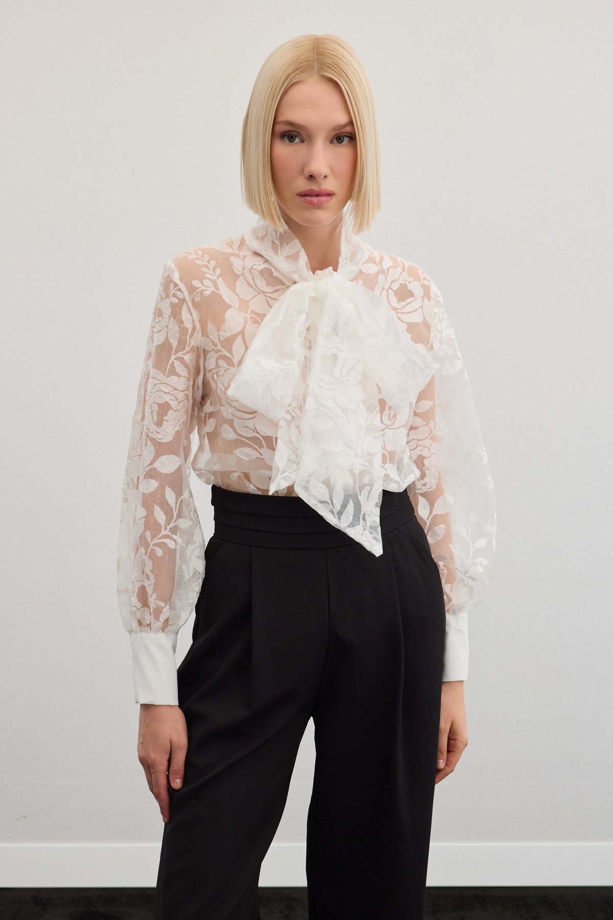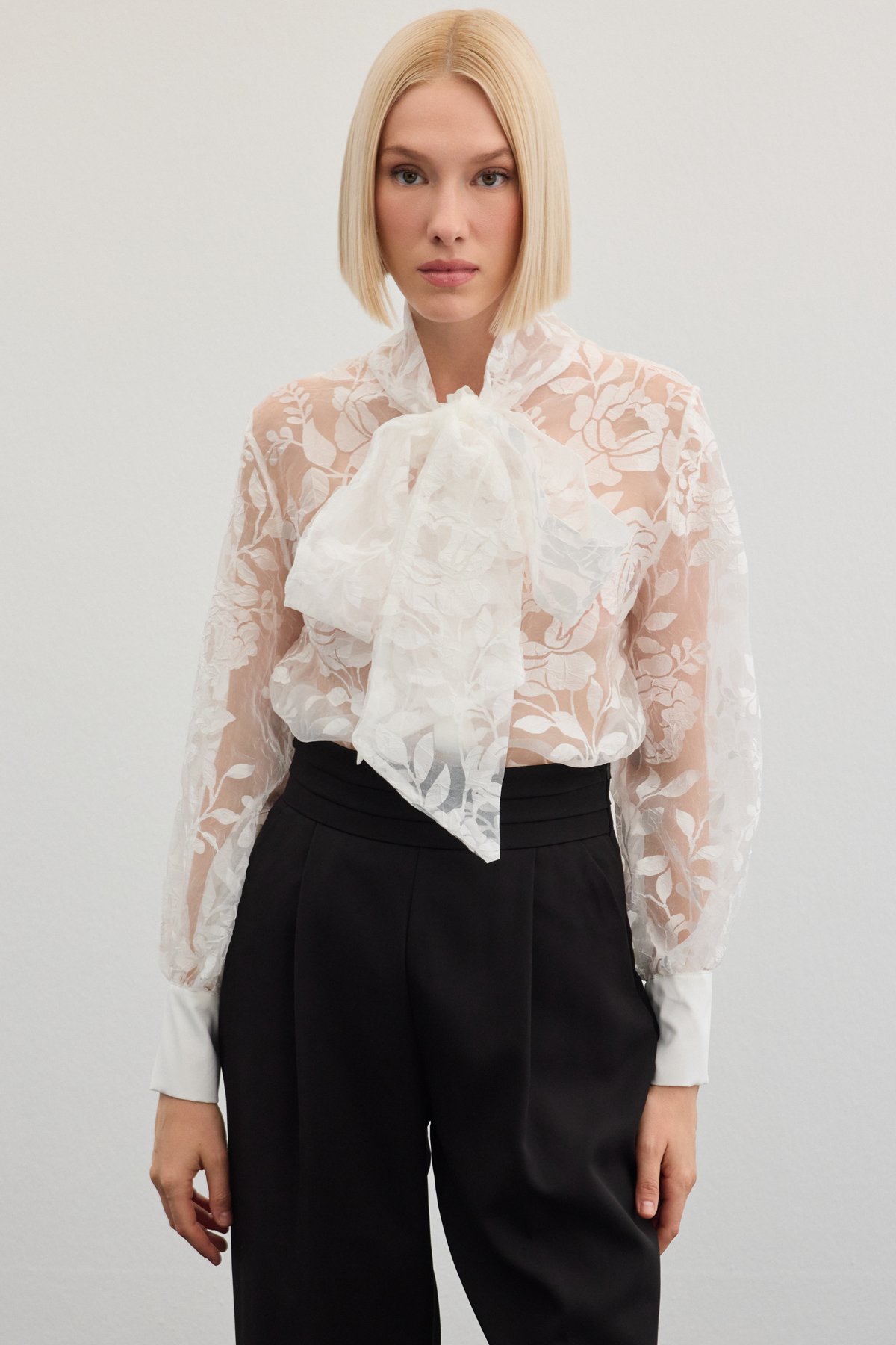 Fularlı Çiçek Desenli Gömlek - Ekru (STN139KGO1776-EK)