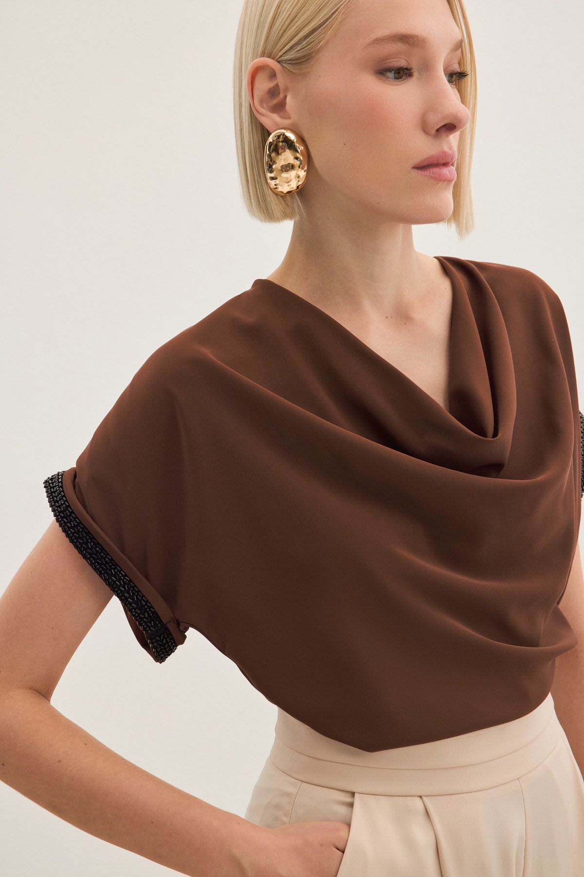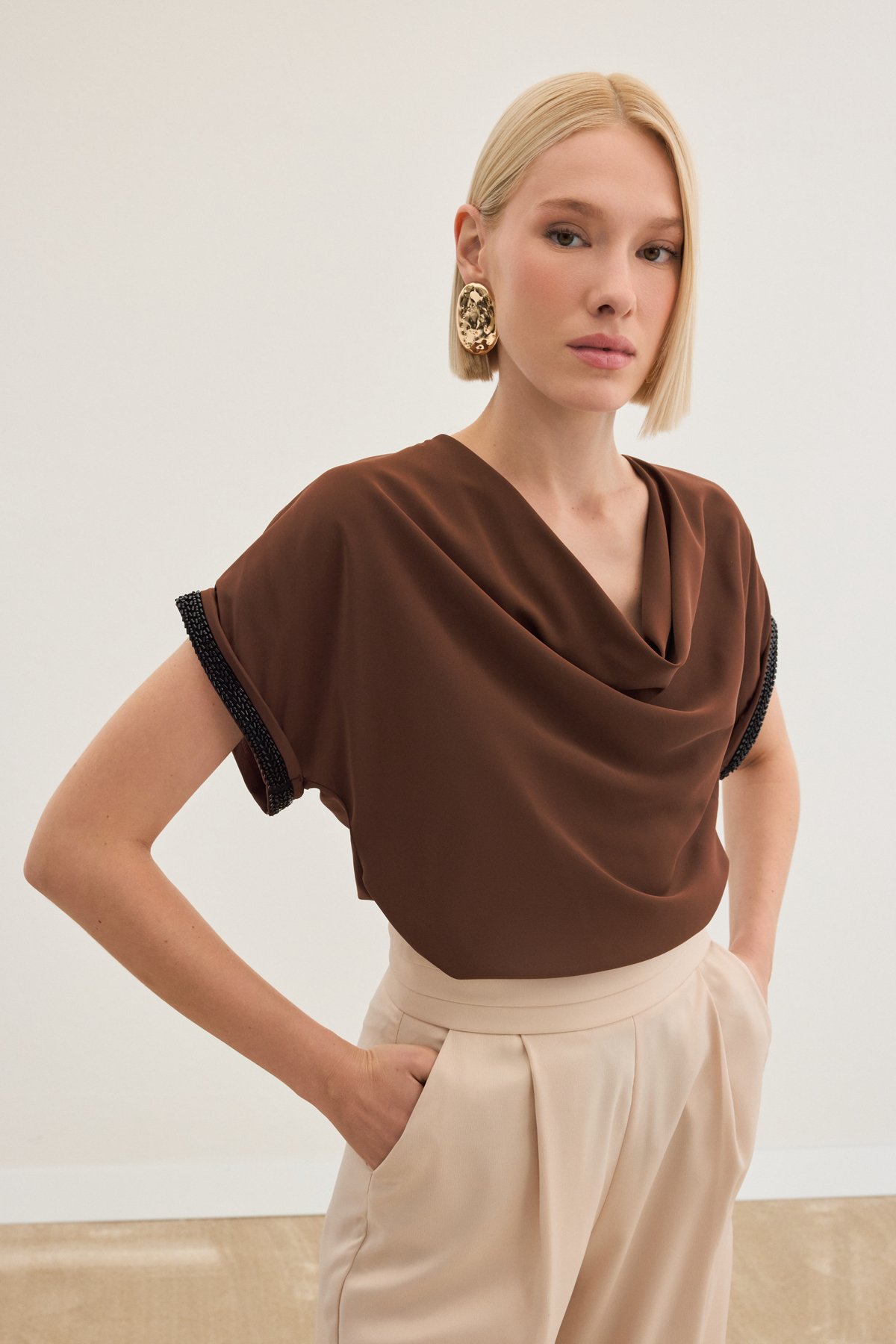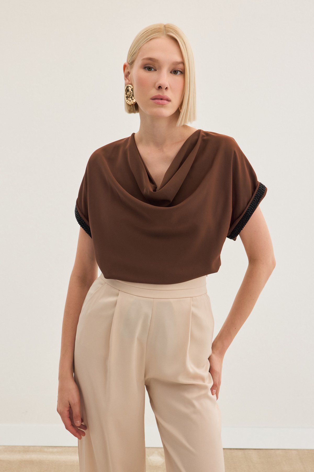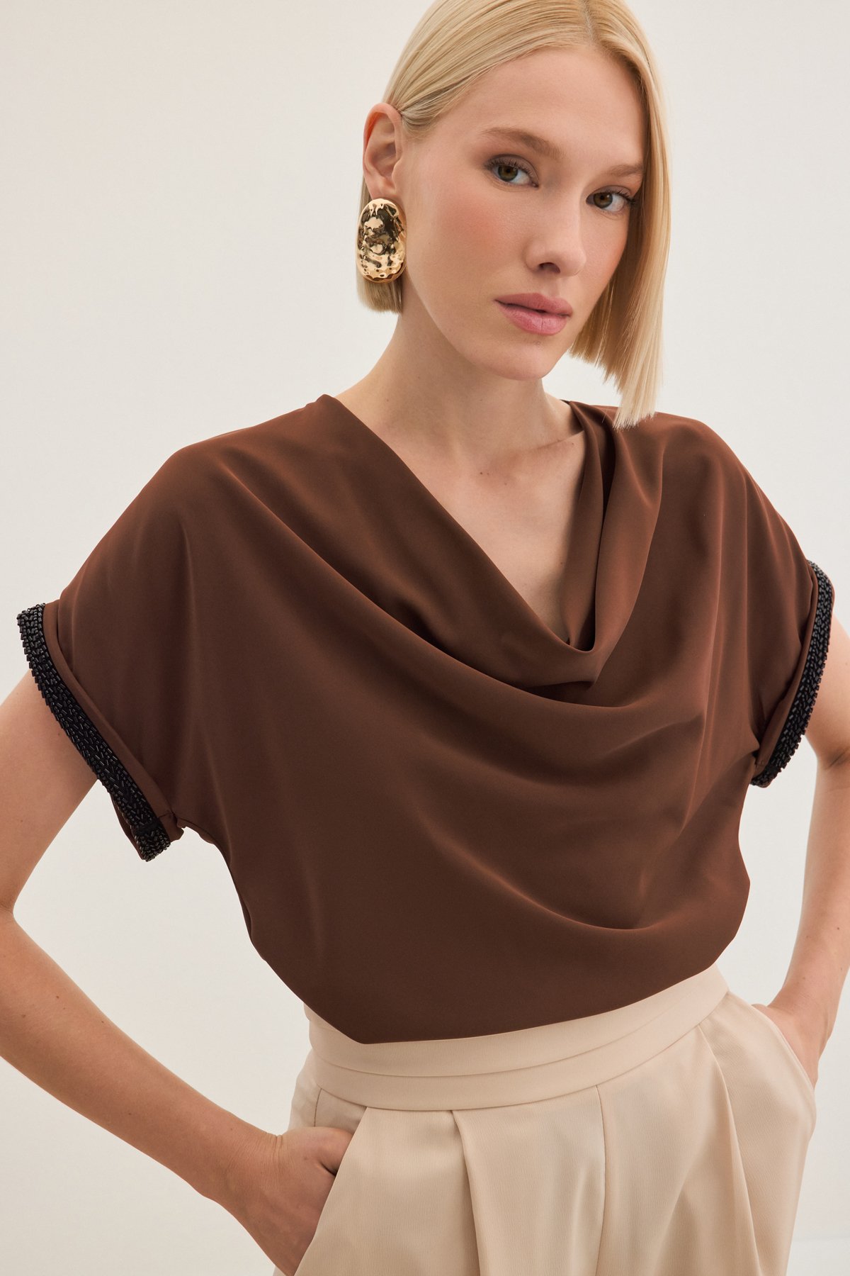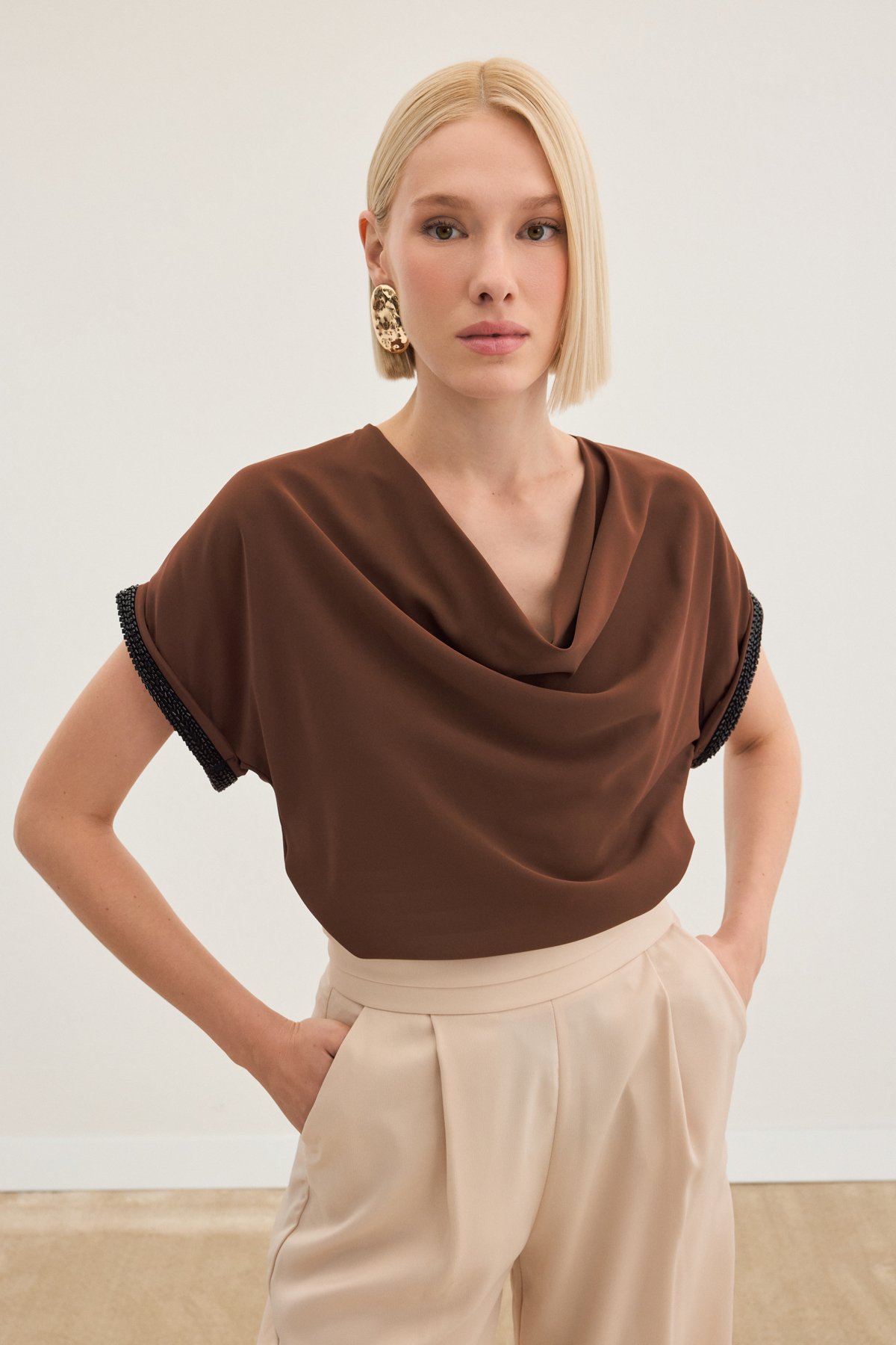 Kollar Taş Detaylı Salaş Bluz - Kahve (STN139KBL1366-014)