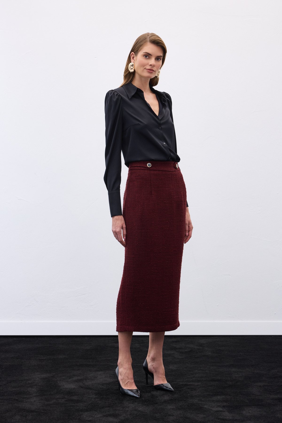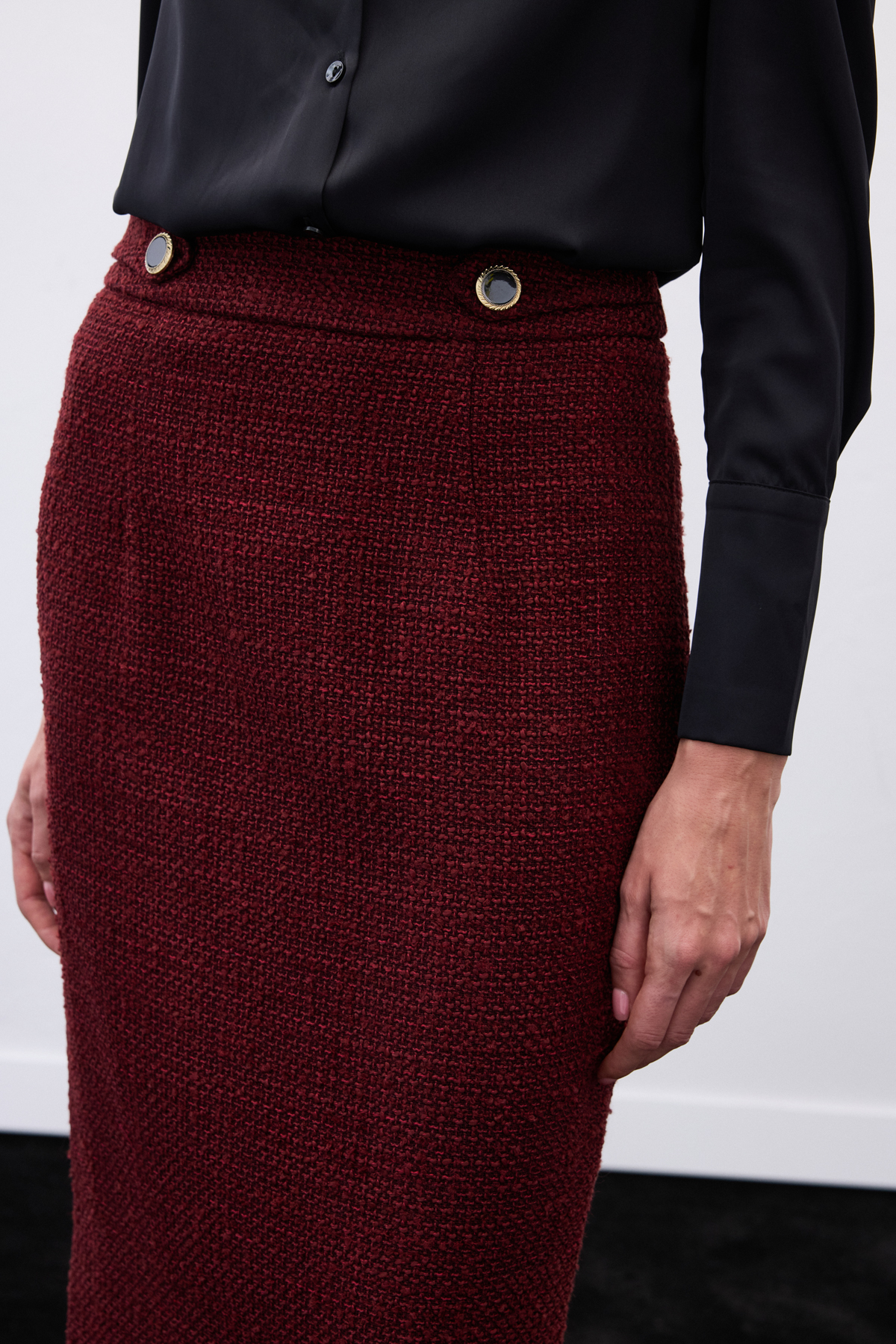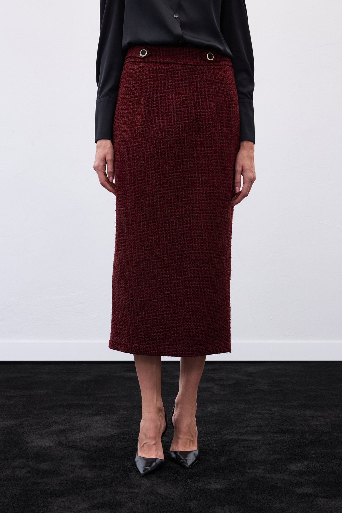 Süs Düğmeli Tüvit Kalem Etek - Bordo (STN139KET1548-BOR)